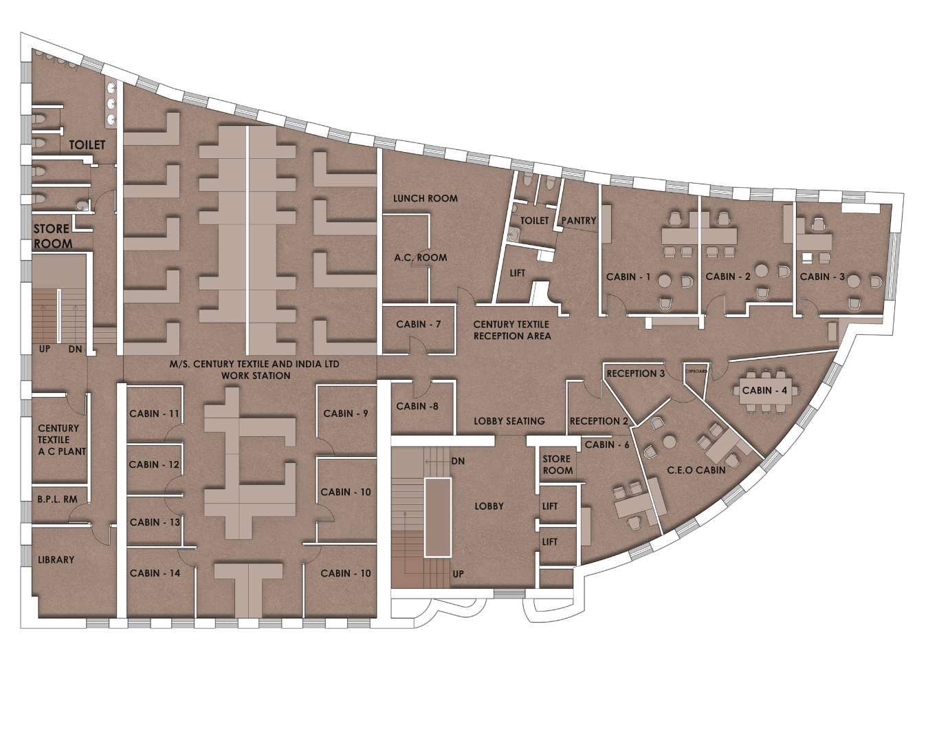 A workspace for one of India’s leading Fashion Yarn businesses - “Raysil” under the management of Grasim Industries. The 10,000-sqft of multifunctional workspace, split over two floors located in one of the historical buildings in South Mumbai, Industry House, serves a mix of uses, ranging from a welcoming lift lobby with landscaping, vibrant reception, and a studio ( a place for showcasing the Raysil products and vendor discussions ) to focused individual work or group collaborations.