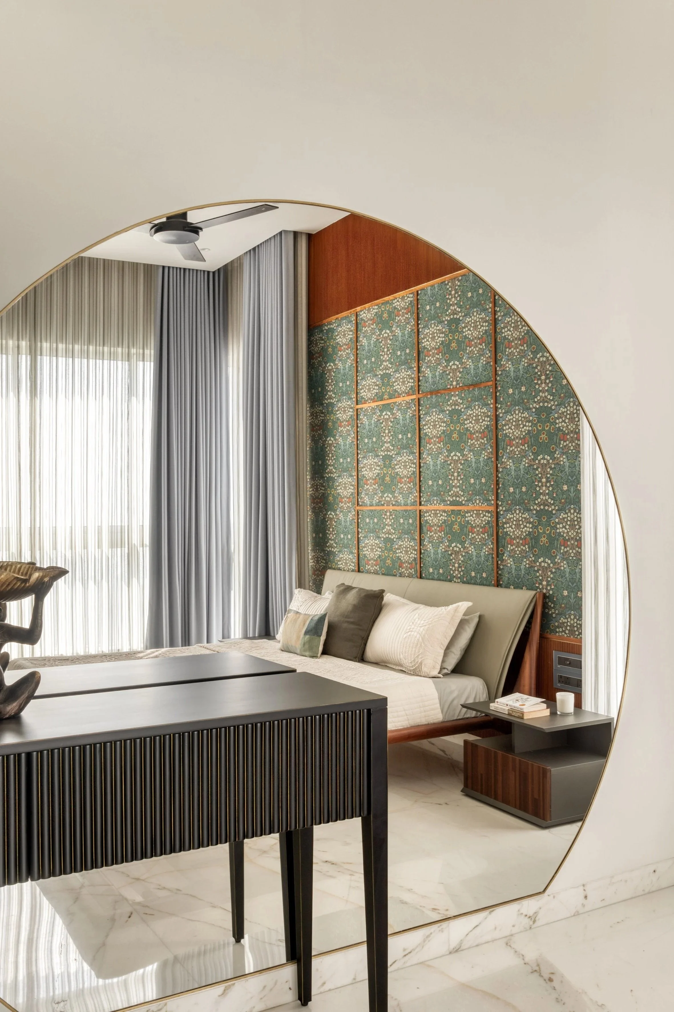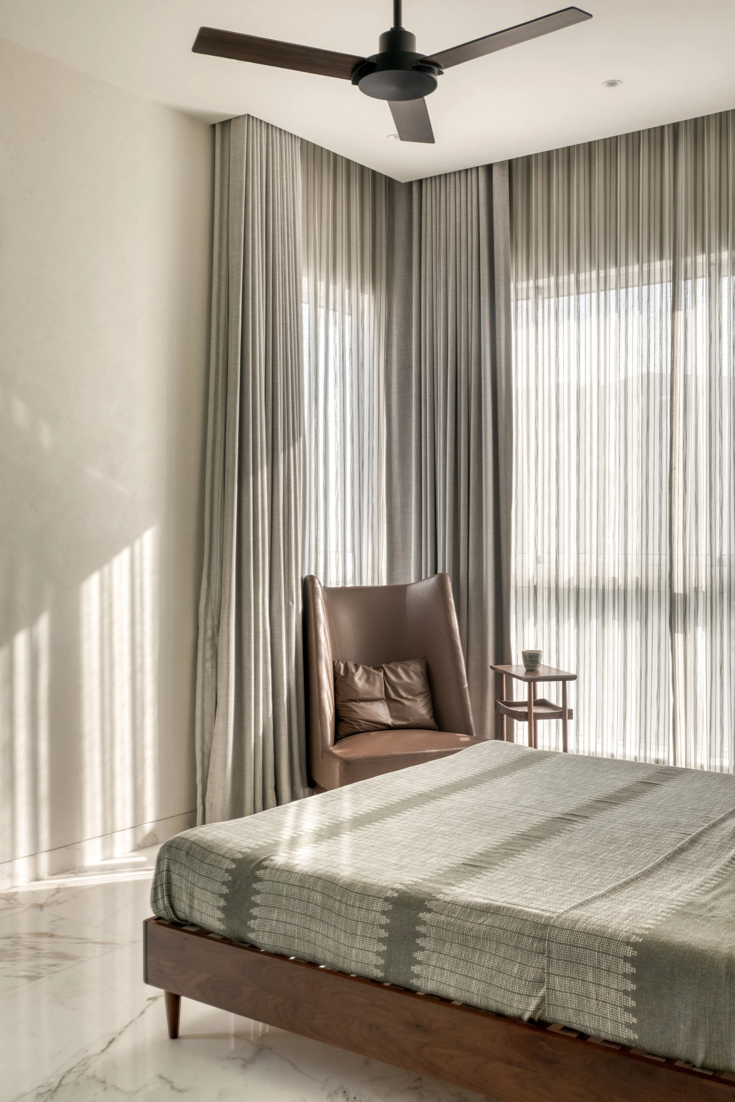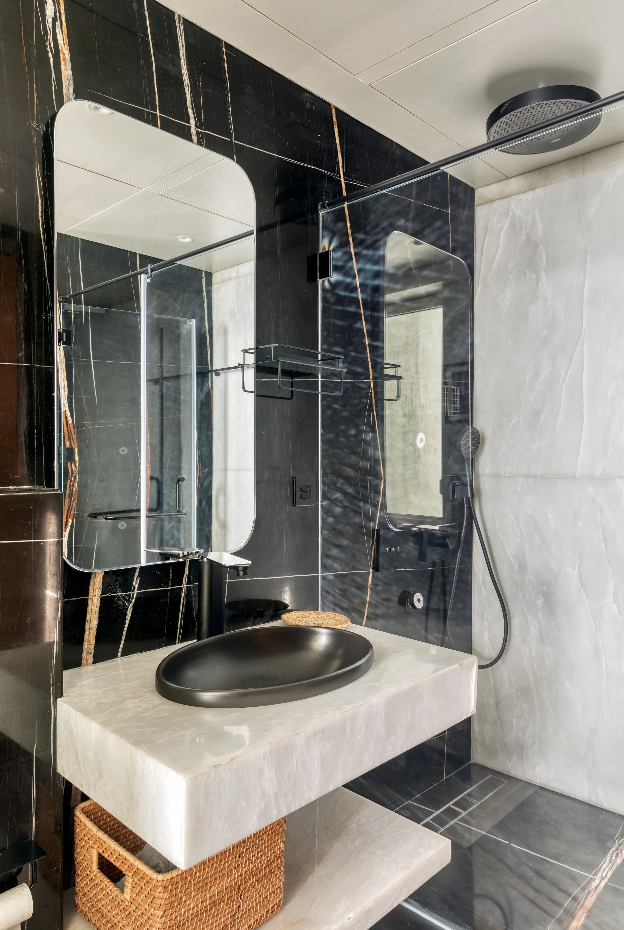 Japanese-inspired sliding doors allow spatial flexibility while concealed storage maintains visual clarity. The material palette remains restrained—teak wood balanced with white marble and subtle brass accents. Furniture blends Italian comfort with Japanese simplicity, while Indian artefacts are curated with discipline.