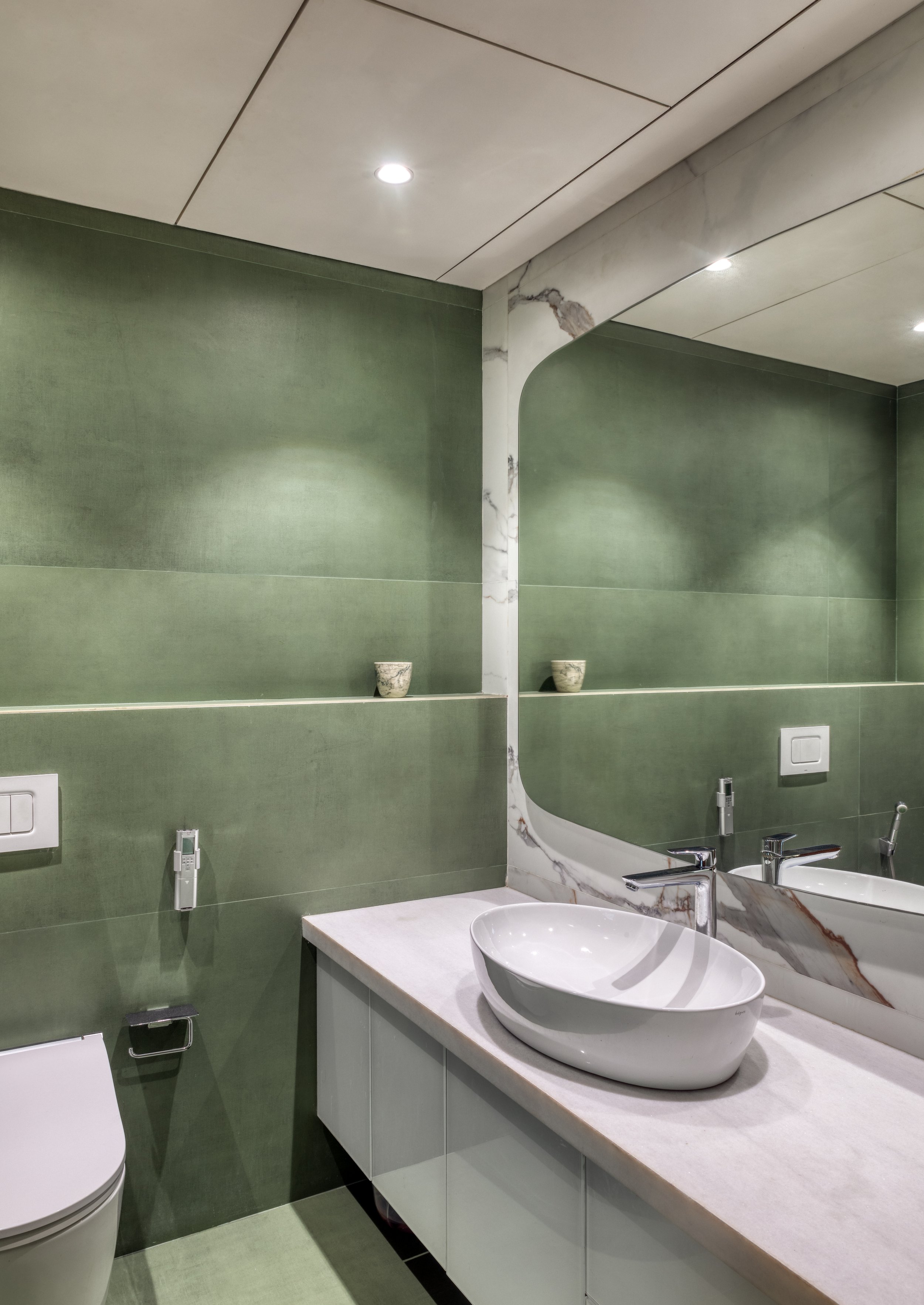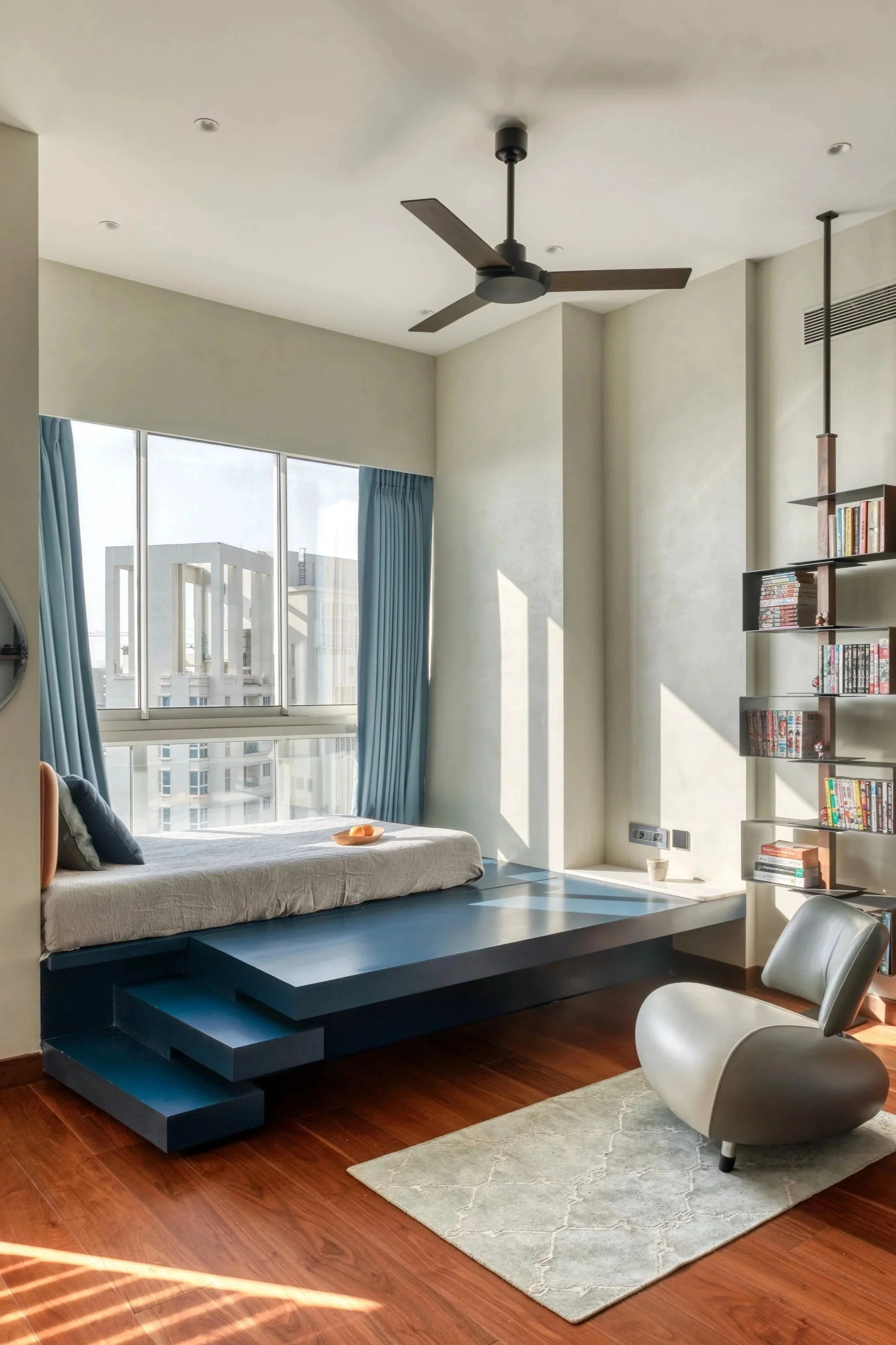 Private Spaces, Personal Moods Each bedroom maintains the overarching minimal language while responding to individual preferences—deep blue and wood for the son’s room, soft pastels for the parents, and a serene master bedroom featuring backlit green Shoji paper as a focal element.